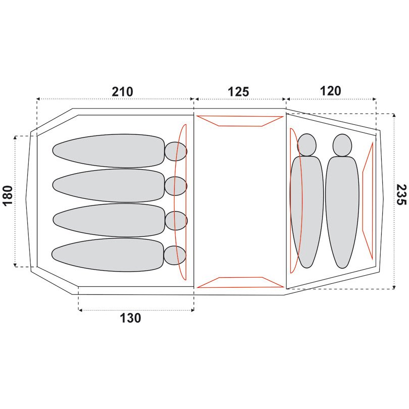 Μεγάλη οικογενειακή σκηνή 4 ατόμων. Μπορεί να κοιμίσει άνετα 6 άτομα! Έχει δύο ξεχωριστές εσωτερικές σκηνές που διαθέτουν τσέπες και κλιπ που διευκολύνουν τη τάξη των πραγμάτων κατά τη διαμονή. Και οι δύο εσωτερικές σκηνές είναι εξοπλισμένες με κουνουπιέρες που βρίσκονται στην είσοδο της σκηνής. Στο μπροστινό και πίσω τοίχωμα της σκηνής υπάρχουν κλειστές οπές εξαερισμού ώστε να αποφεύγεται η υπερβολική συμπύκνωση των υδρατμών στην εσωτερική επιφάνεια. Τα σχοινιά έχουν έντονο χρώμα ώστε να εντοπίζονται εύκολα στο σκοτάδι και όλες οι ραφές της σκηνής είναι πλαστικοποιημένες.
